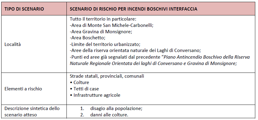Per il comune di Conversano l’analisi del rischio di incendio di interfaccia è stata effettuata secondo i criteri sopra esposti e attraverso l’esame degli stessi scenari già individuati e definiti dal Servizio di Protezione Civile Regionale, anche attraverso la verifica della sussistenza attuale delle caratteristiche di presenza e di tipologia della vegetazione poste alla base dell’elaborazione della “mappa del rischio di incendio di interfaccia”. Si sono, inoltre, integrati i dati e le schede già redatte per il “Piano Antincendio Boschivo della Riserva Naturale Regionale Orientata dei laghi di Conversano e Gravina di Monsignore” ai sensi della normativa vigente e, in particolare, dell’Ordinanza n. 36606 del Presidente del Consiglio dei Ministri art. 1 cm. 6, redatto per il Comune di Conversano nel 2008.